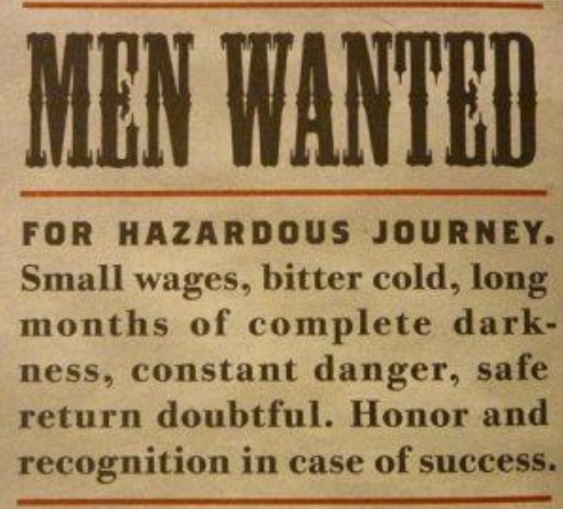 “PROCURA-SE VOLUNTÁRIOS. Para uma viagem perigosa, salários baixos, frio intenso, longos meses de completa escuridão, constante perigo, retorno duvidoso. Honra e reconhecimento em caso de sucesso. “